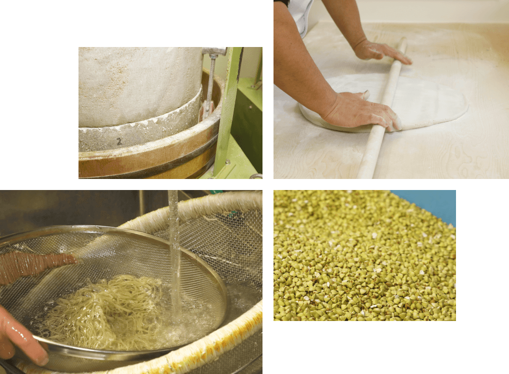 自家工場の製粉機械類と石臼による製粉を行い、そばを打っています。